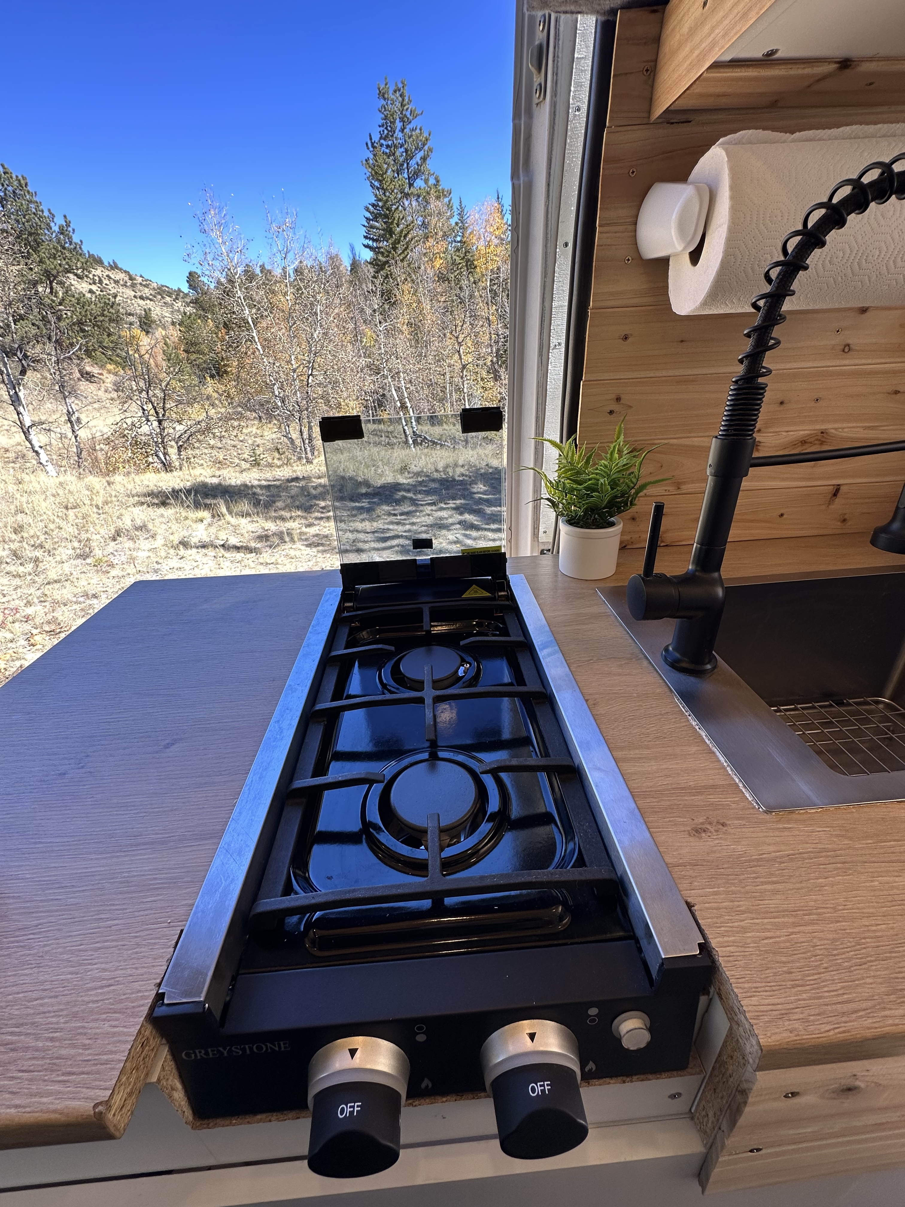 Prepare delicious meals on the go with our campervan's fully equipped kitchen, including a gas-powered range, refrigerator & freezer, and all the necessary cookware.